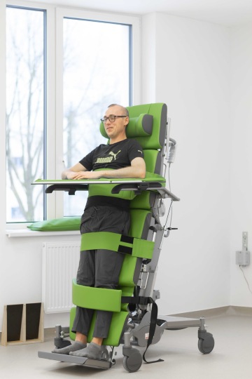 - Díky inovativnímu designu je možné vertikalizovat pacienta za přítomnosti pouze jednoho terapeuta, což šetří čas a zvyšuje efektivitu terapeutických postupů.